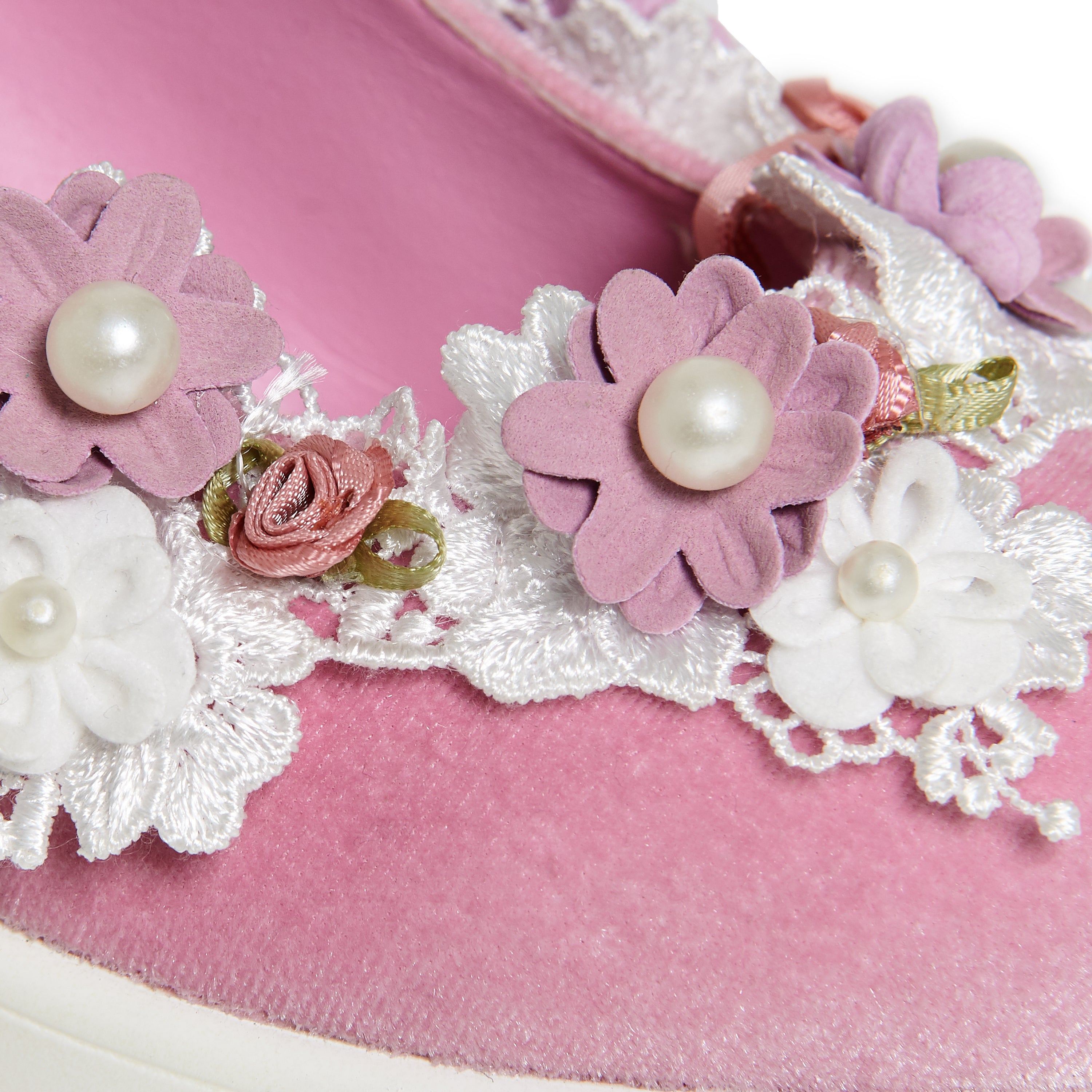 - Soft pink velvet upper with white lace trim