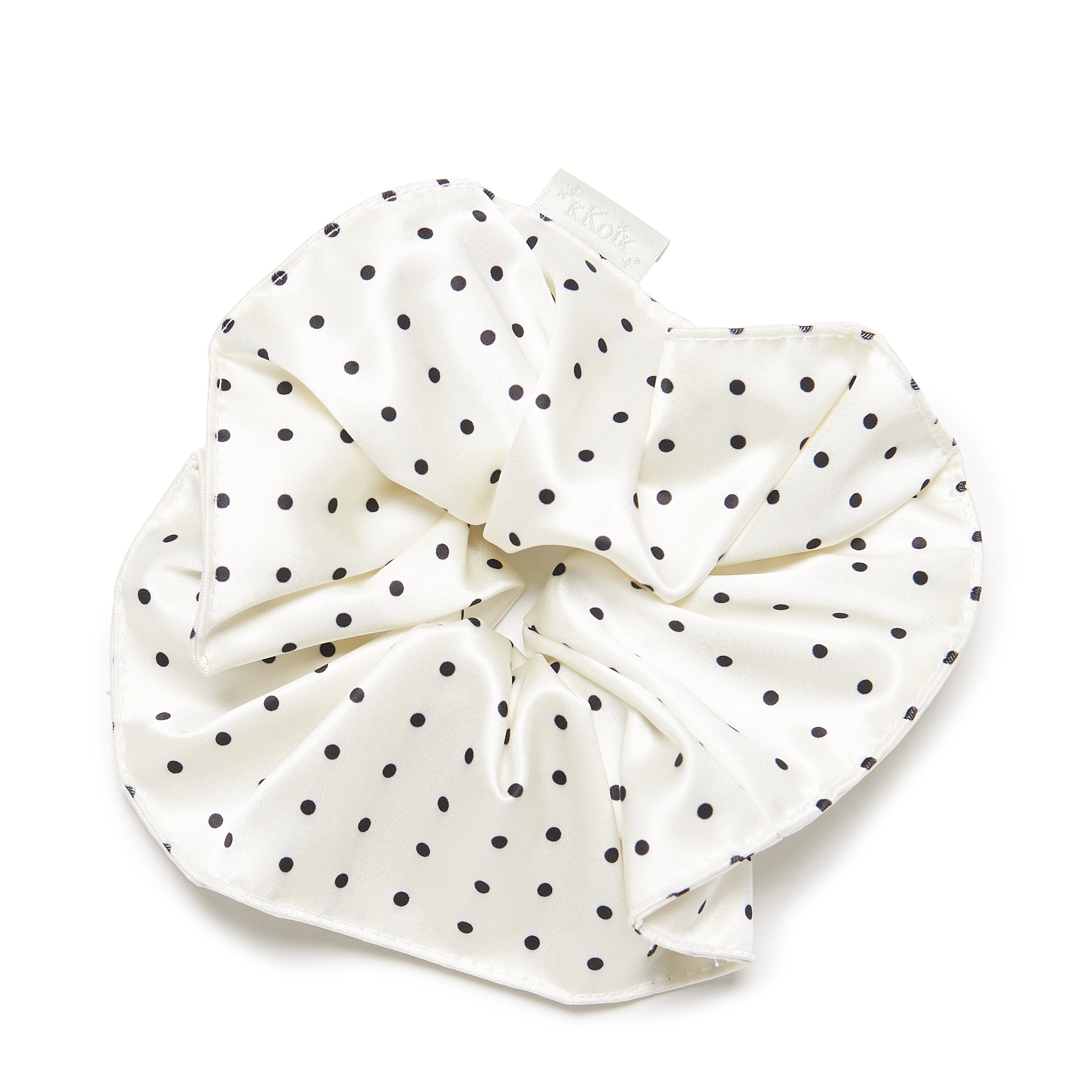 A vintage moment with a KOI twist. This oversized satin scrunchie in creamy ivory is scattered with classic black polka dots for a playful yet polished finish. It’s giving retro Parisian. Whether perched high on a ponytail or wrapped around a messy bun, this one’s guaranteed to elevate your everyday look.