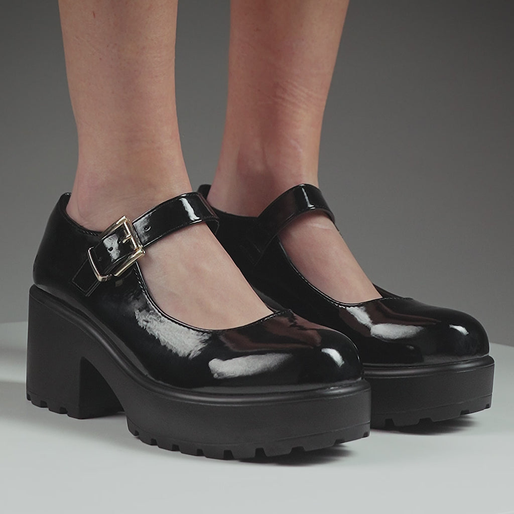 These Black Patent Single Strap Chunky Platform Mary Janes have been crafted from a faux leather patent offering a sleek and mirror like finish making these smooth to the touch. The padded insole and matching PU lining combined make these a pair you can wear comfortably throughout the day.