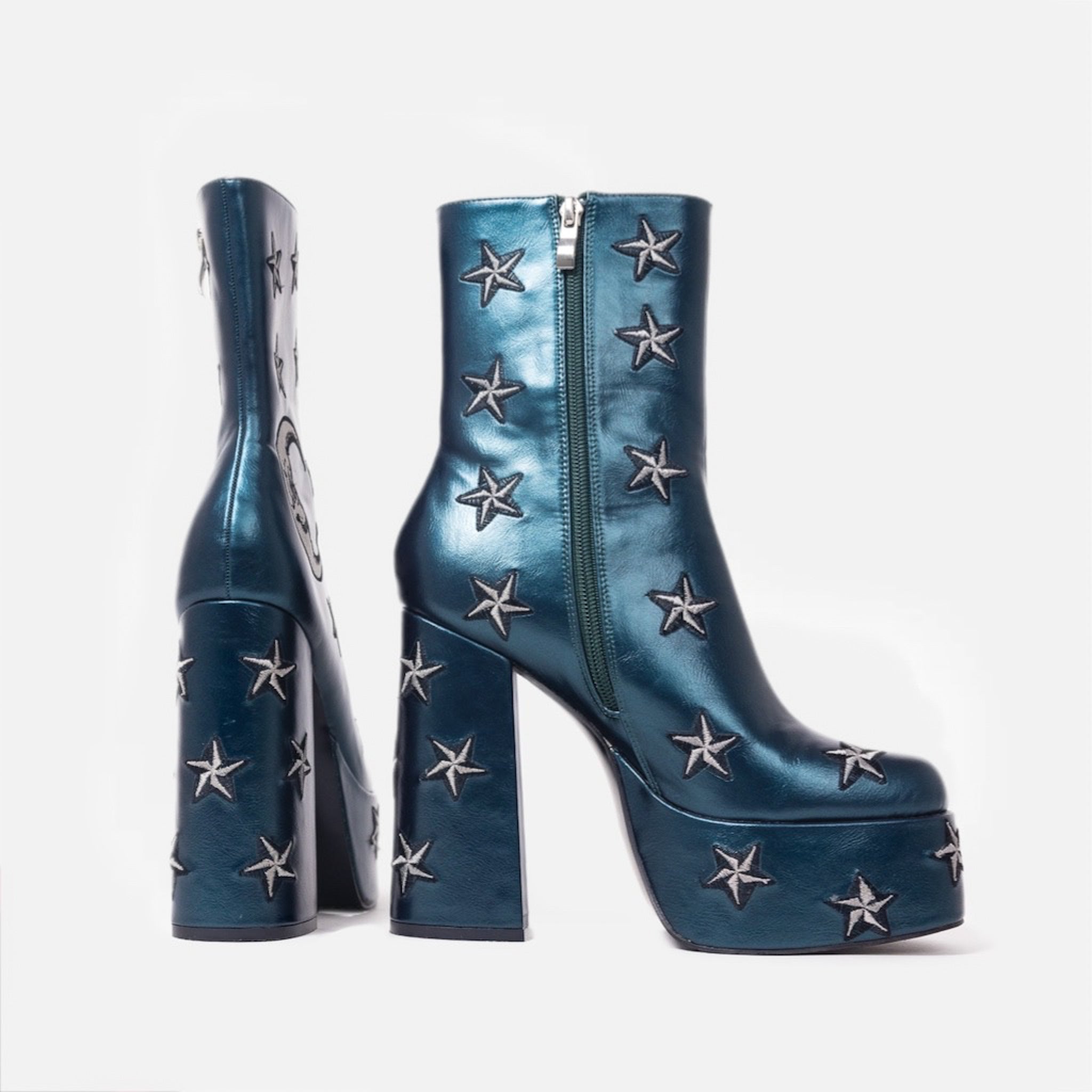 What's up witches? Feel magically creepy in the most glamorous way in these chunky ankle boots for women. With enchanting moon and stars embroidery, these celestial platform heels will have you ready to cast a spell this Halloween. Heeled boots are the perfect way to add height to your look this fall, and these come in a spooky shade of teal green.