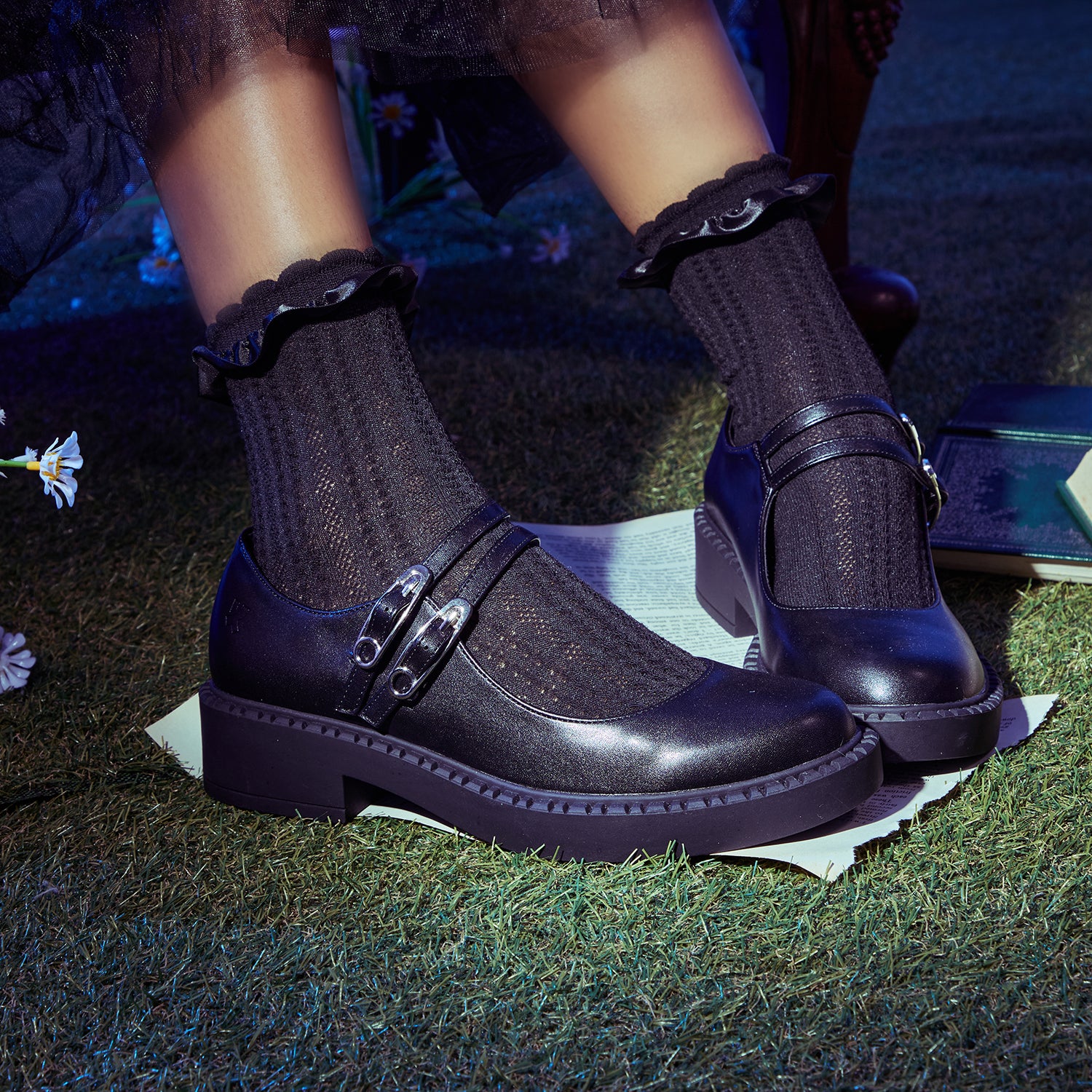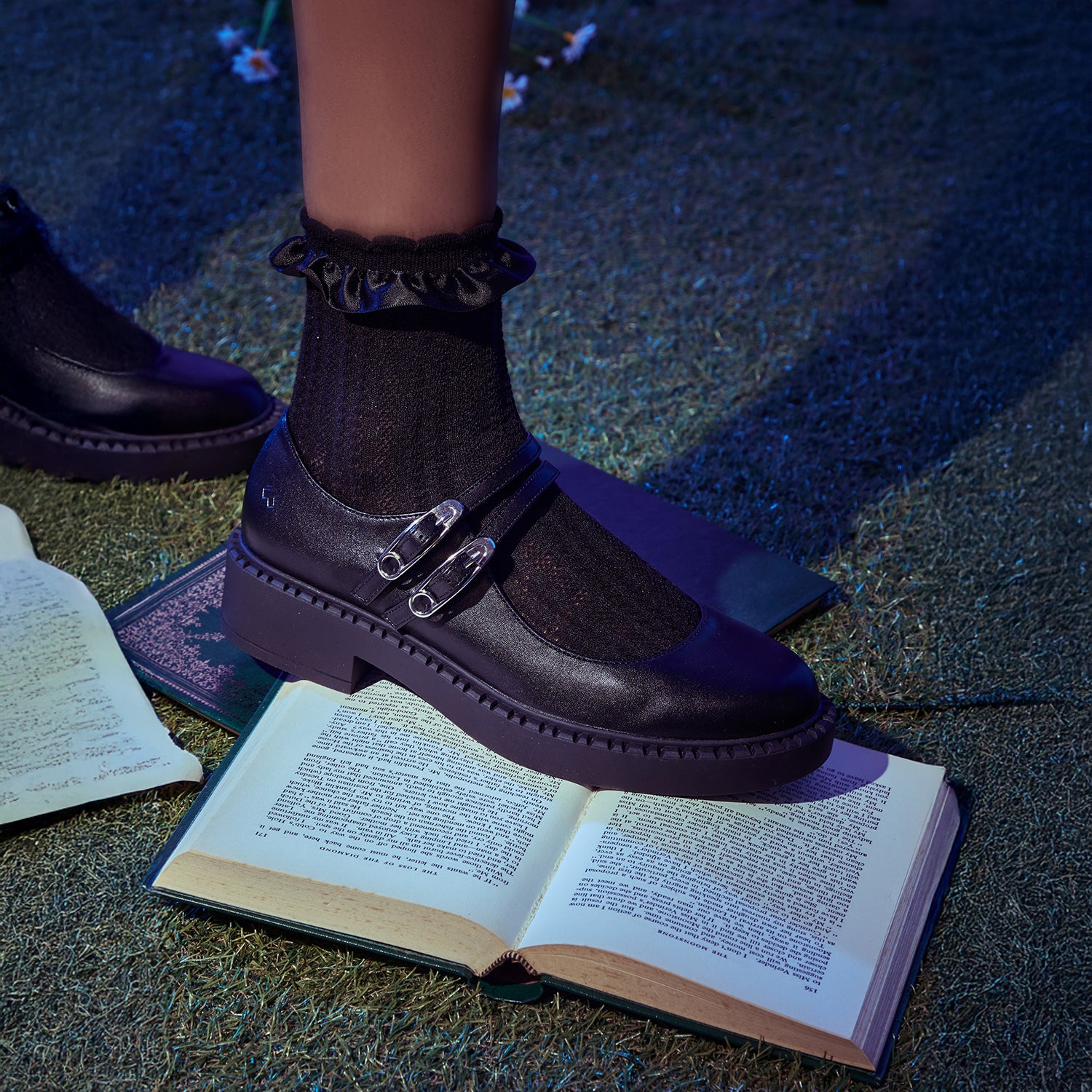 Meet the Mary Jane that breaks the rules. A rebellious twist on a classic, these faux leather beauties combine preppy charm with a punk edge. The upper is mostly on the textbook side, with faux leather and a retro silhouette, but then in contrast: The iconic double strap is adorned with safety pin-shaped buckles, blending delicate and daring into one comfortable, wearable package. Whether you’re feeling sweet or spiky, these shoes have got you covered. Perfect for those who like a little polarity in their style, opposites really do attract.