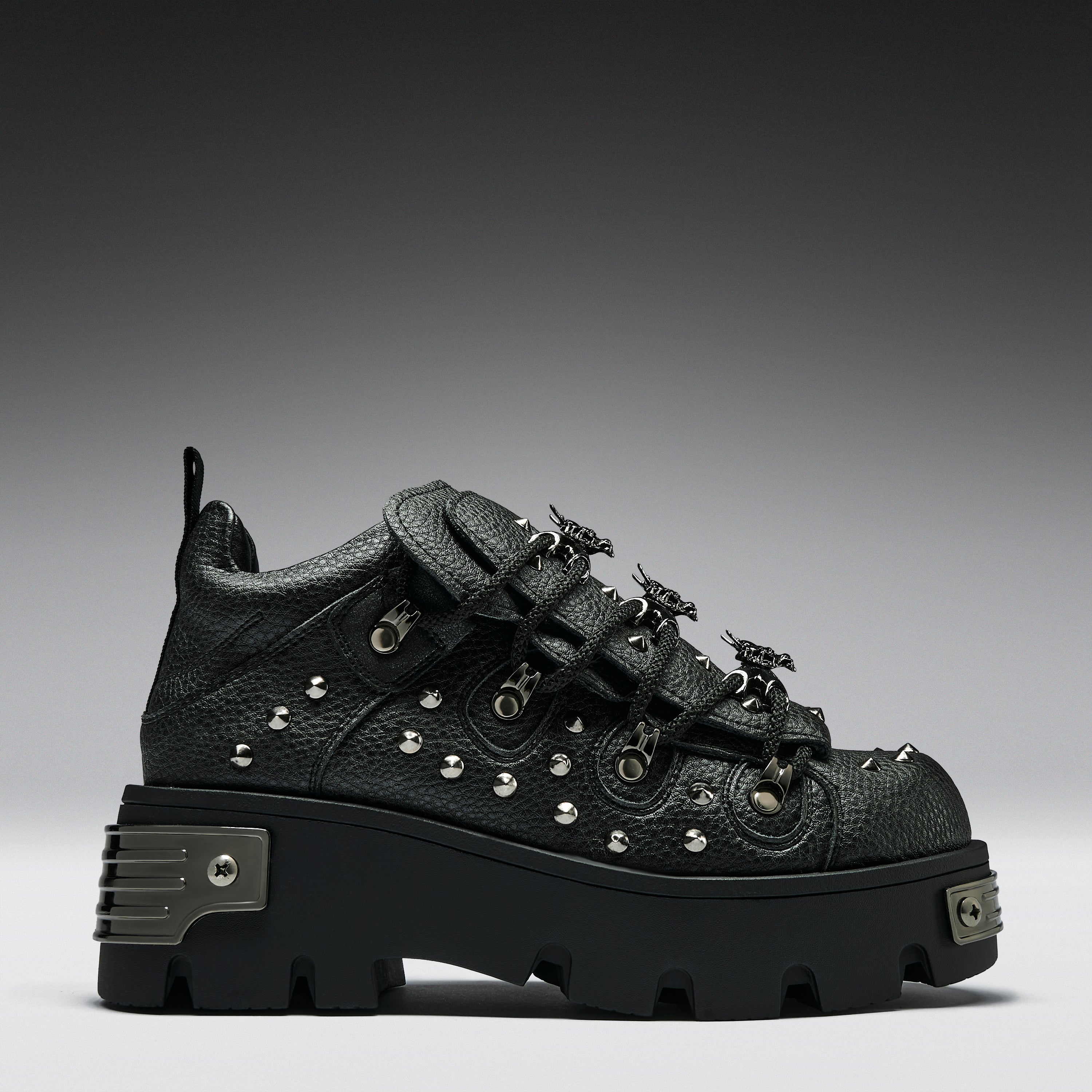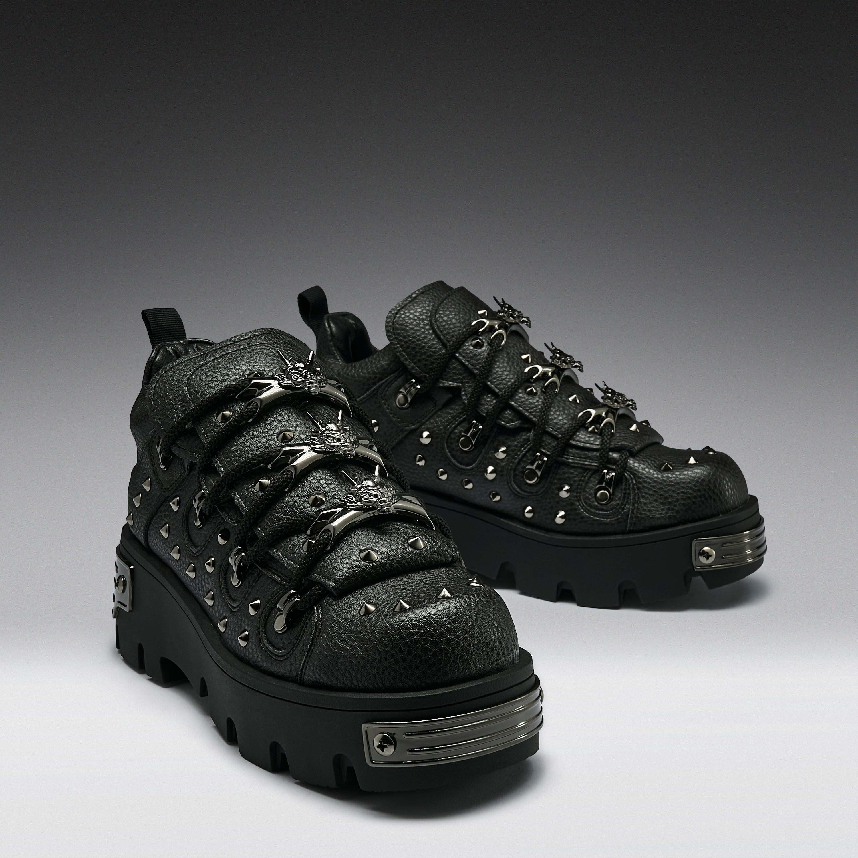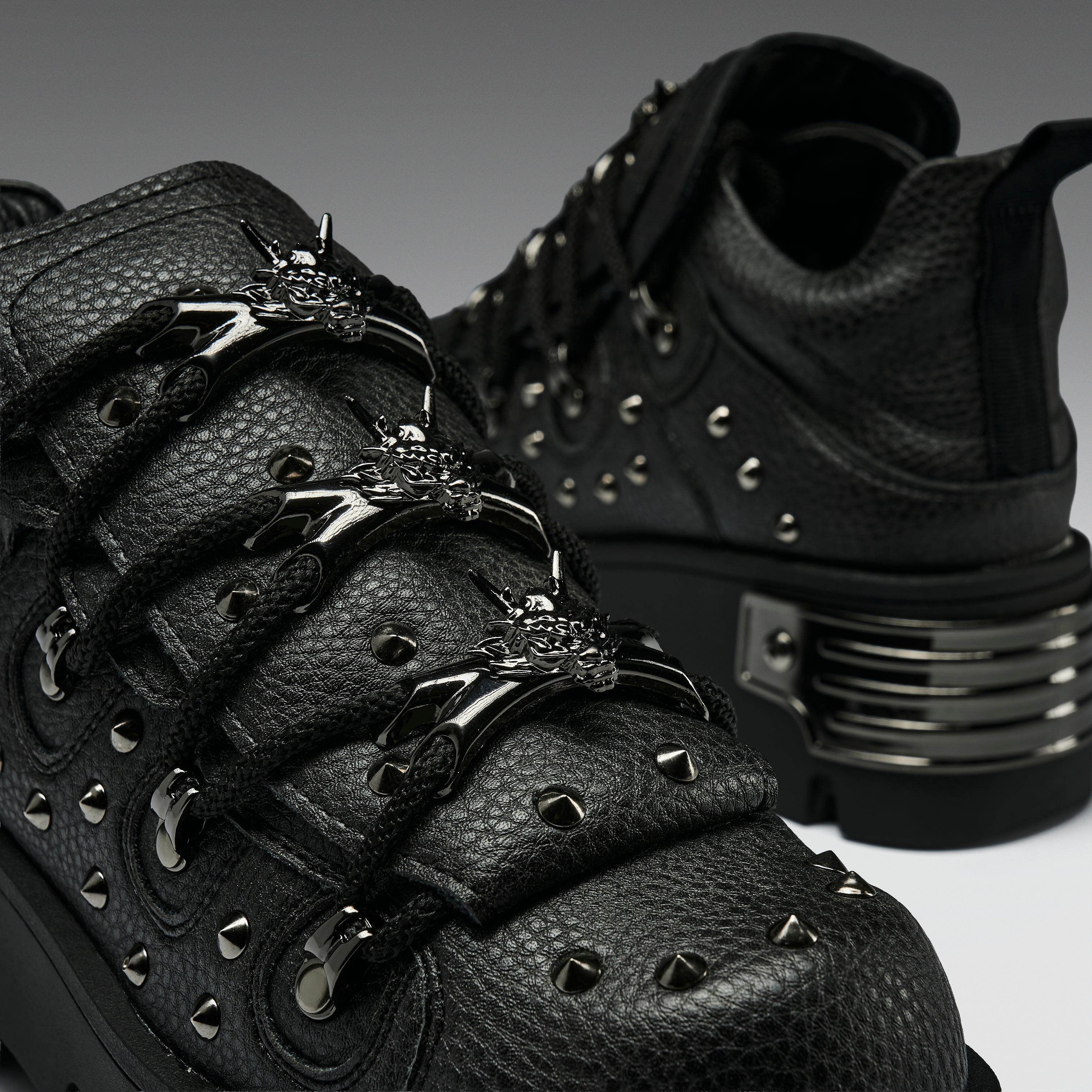 Unleash chaos. This all-black beast is the darker, harder evolution of our OG Rimo style. Covered in jet black spikes and armoured dragon hardware, the Thurnax is a shadow-dwelling icon for the bold. Metal-plated heel details and double-stacked soles bring the drama — just add attitude.