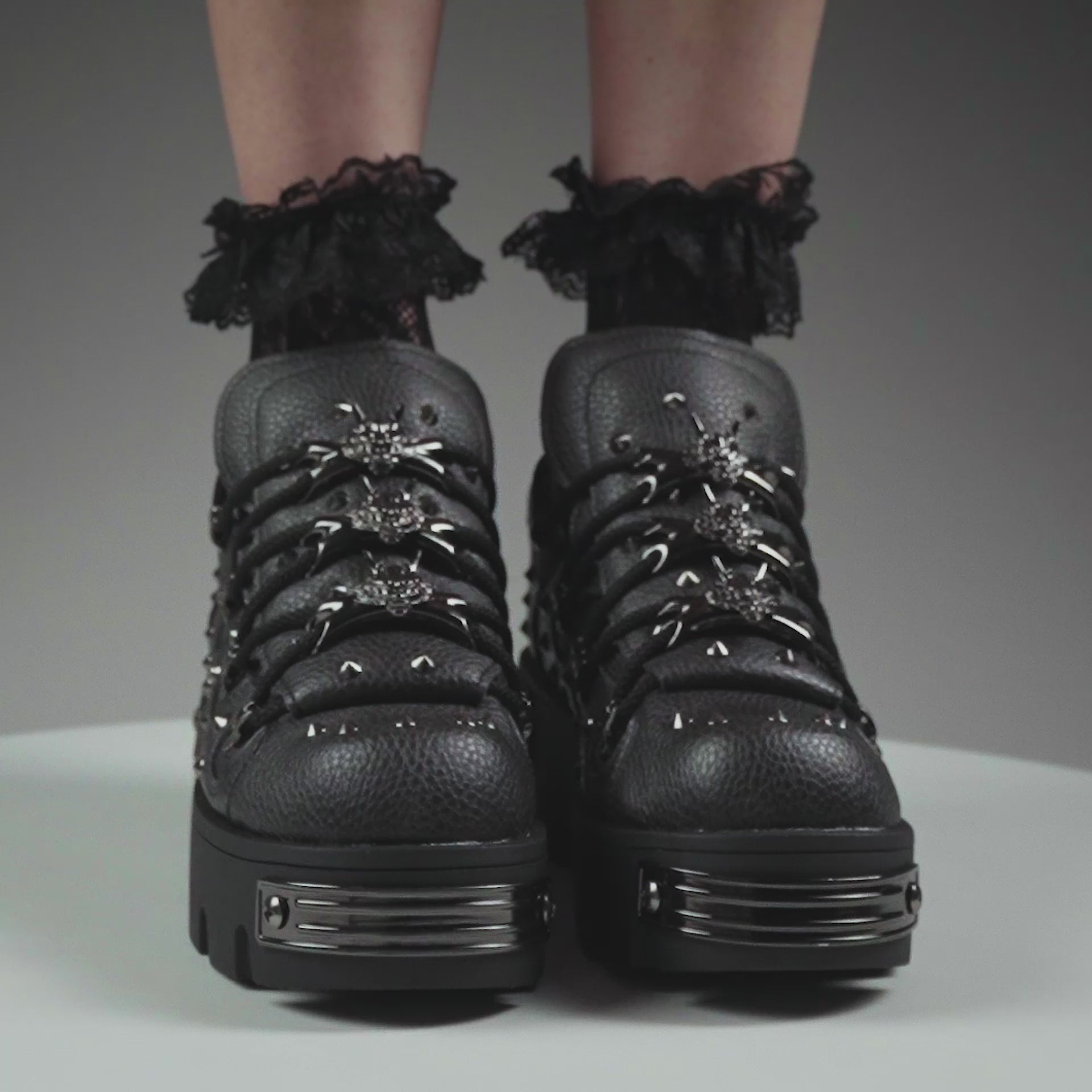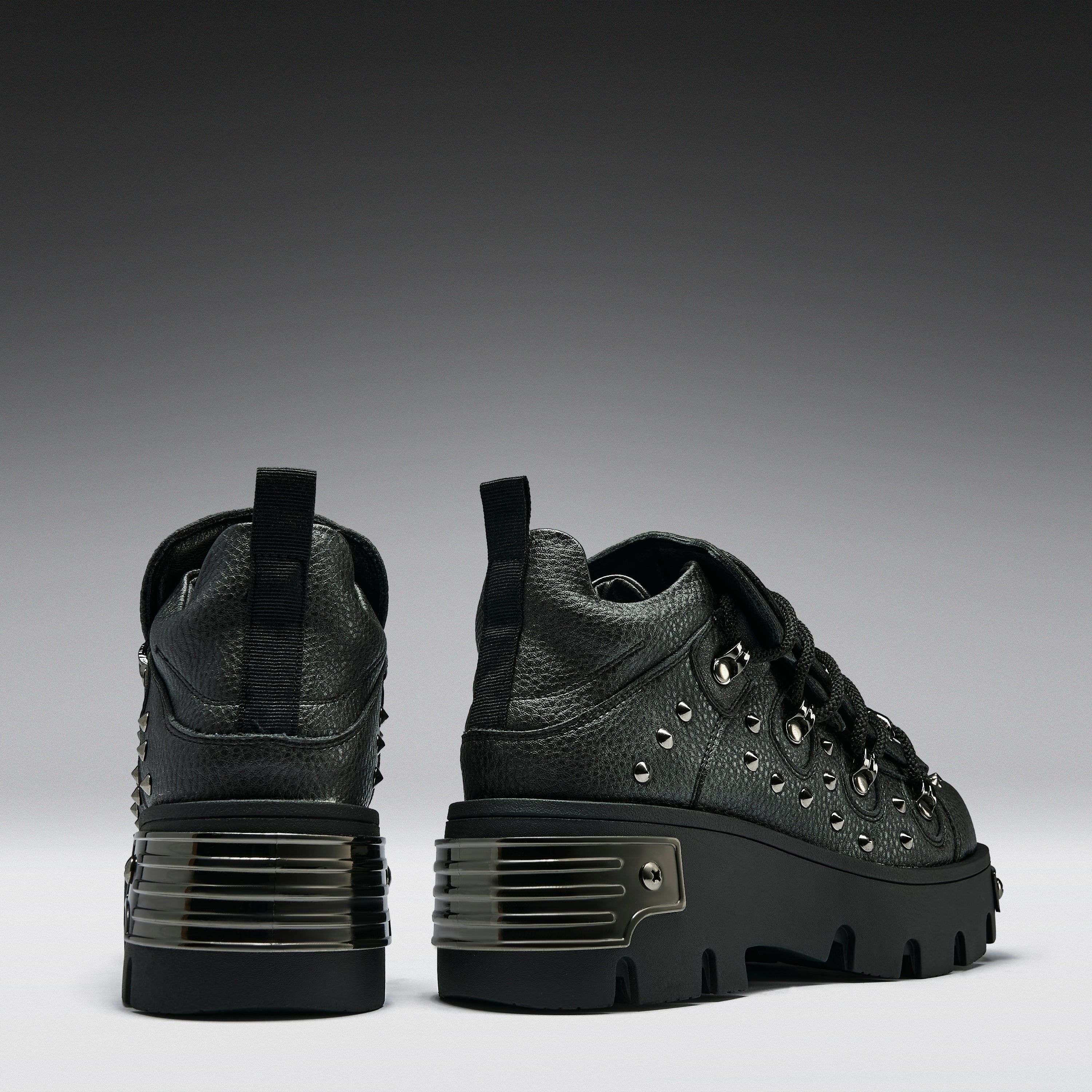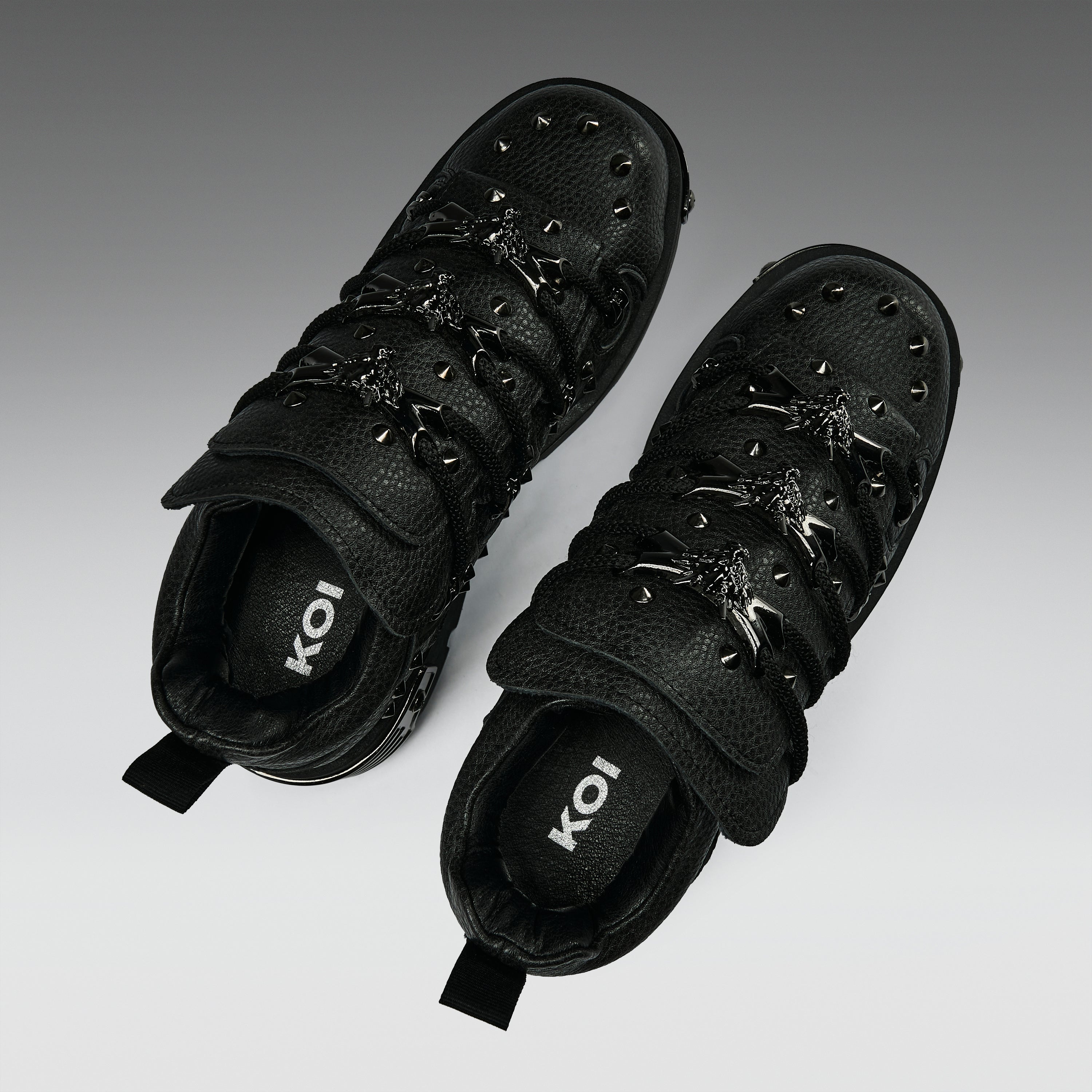 Unleash chaos. This all-black beast is the darker, harder evolution of our OG Rimo style. Covered in jet black spikes and armoured dragon hardware, the Thurnax is a shadow-dwelling icon for the bold. Metal-plated heel details and double-stacked soles bring the drama — just add attitude.