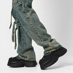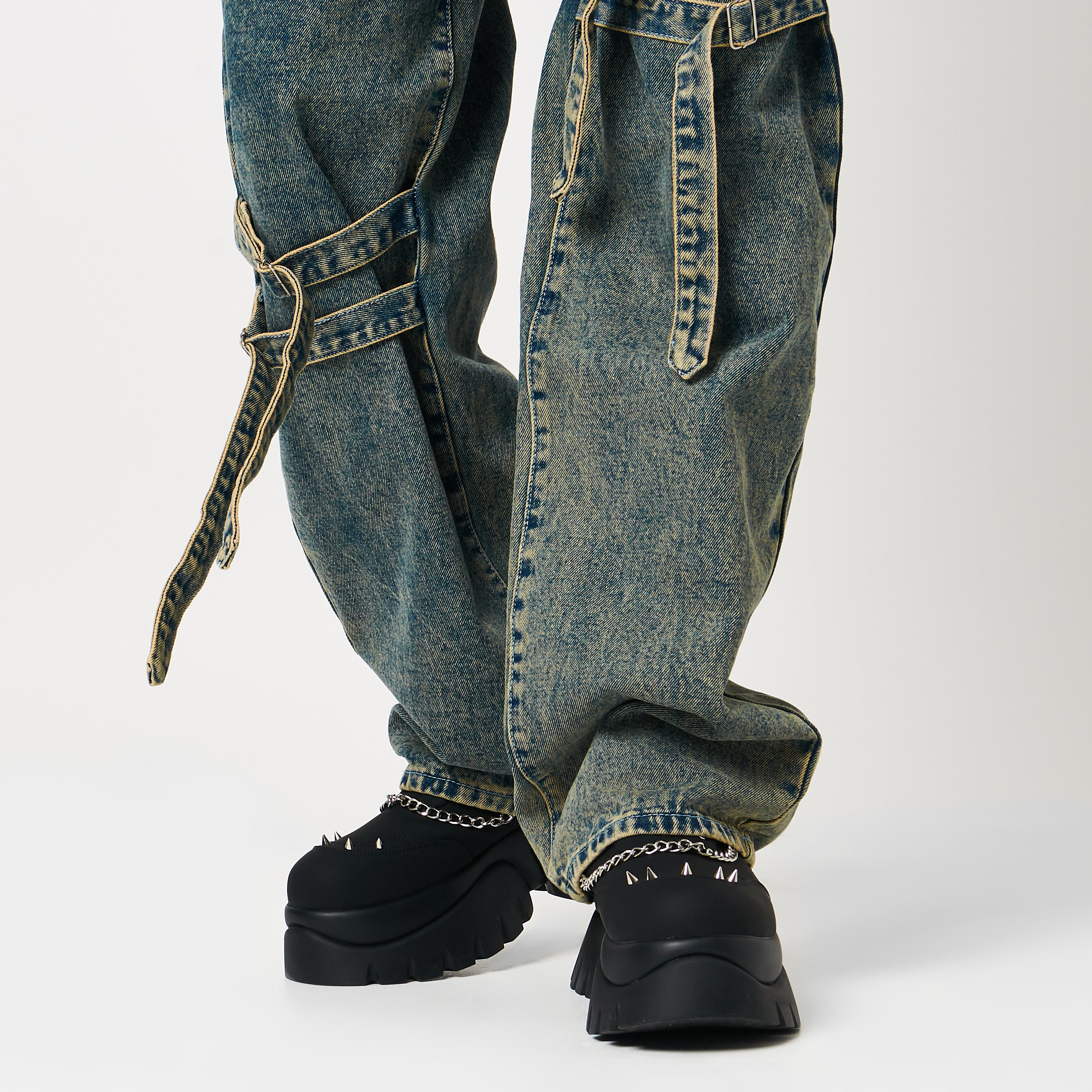 The "Monster" sole has been a KOI signature, and after repeated requests to bring it in men’s Sizing, we made the investment to expand the size range, so expect more styles on this chunky sole! The upper is classic KOI grunge, with a shadowy matte black finish contrasted by silver metal detailing, including a bold chain running across the upper. Adding to the hardcore vibe, small spikes are placed along the front, giving these an extra 'sharper' edge. The combination of lace-up and velcro closures gives these an athletic feel, and with a padded tongue, collar, and insole, they're just as comfortable as they are bold. You can create absolutely immaculate fits, especially when paired with a baggier pant, as shown by our model.