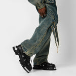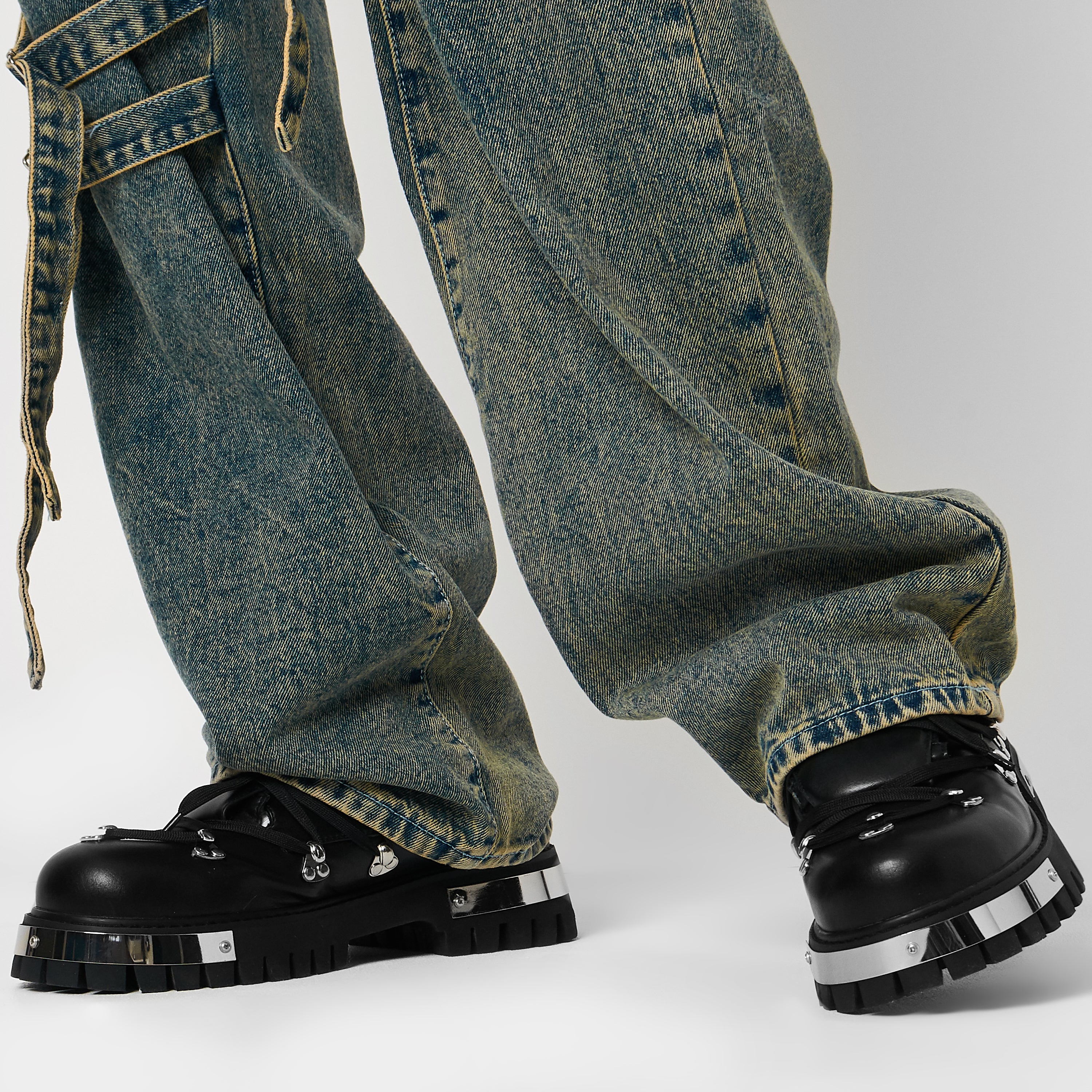 We've introduced these hardware heavy, low-cut lace-up shoes with some serious details. The oversized, padded tongue gives the laces more real estate, creating a bold, layered look while offering extra comfort. The bright silver ski hooks sit low, perfectly paired with the gleaming metal plates on the front and back of the outsole for a hardcore vibe. When paired with baggy trousers, the Details really pop, making these shoes the focal point of any outfit. We tested the lace-up pattern thoroughly in-house to ensure they’re comfortable for both lacing and walking, and they passed, hence why you're seeing them here! The outsole is made from high-quality rubber, providing flexibility and durability for all-day wear while being chunky. To finish things off, the upper material is a durable and sleek faux leather which acts as the perfect canvas.