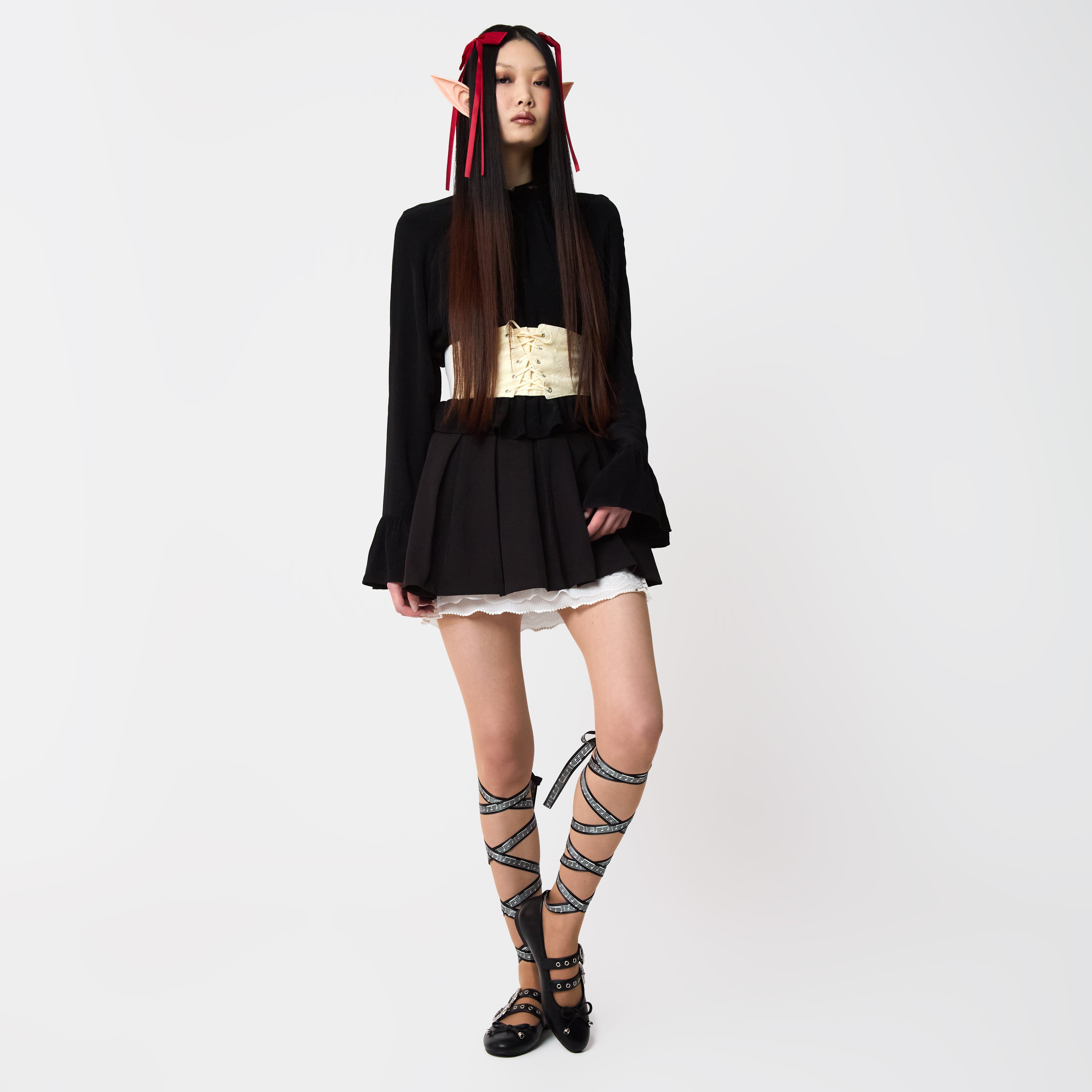 You can just picture a charming bard dancing and singing their song in these ballet flats. With stunning Details such as ornate buckles, musical note leg ribbon, and hidden debossed bard lute logo on the strap. Live your bard fantasy and dance like no one is watching.