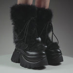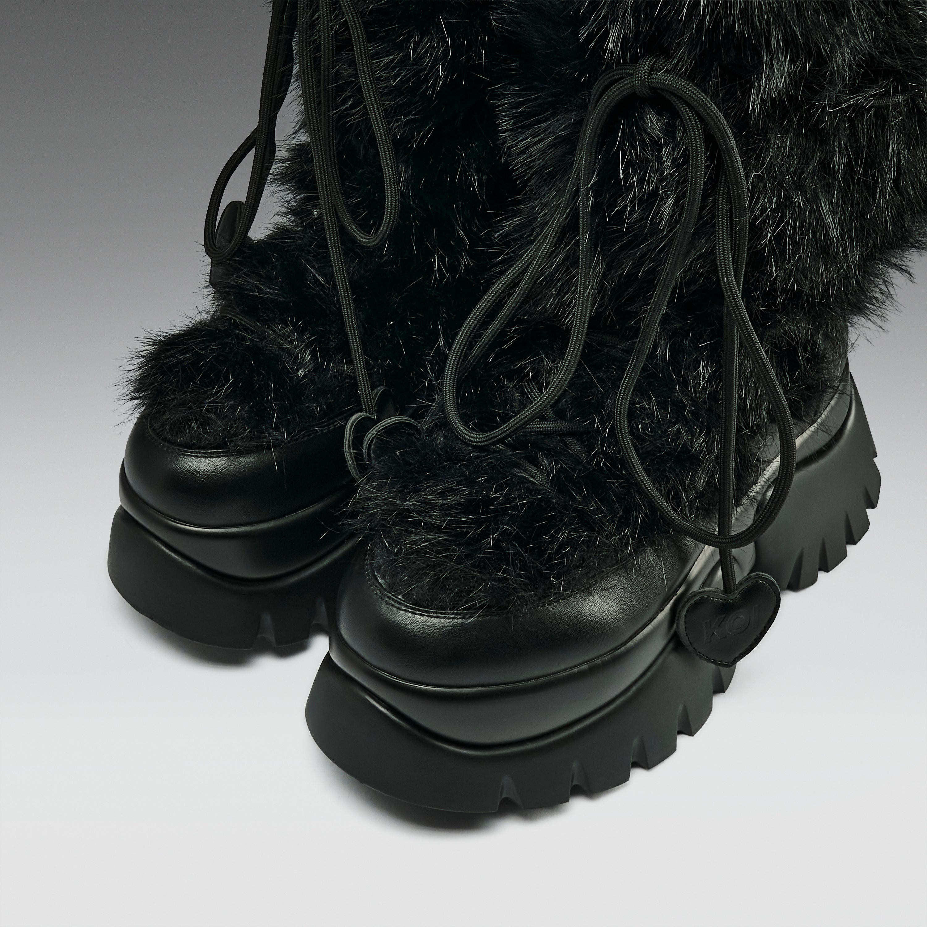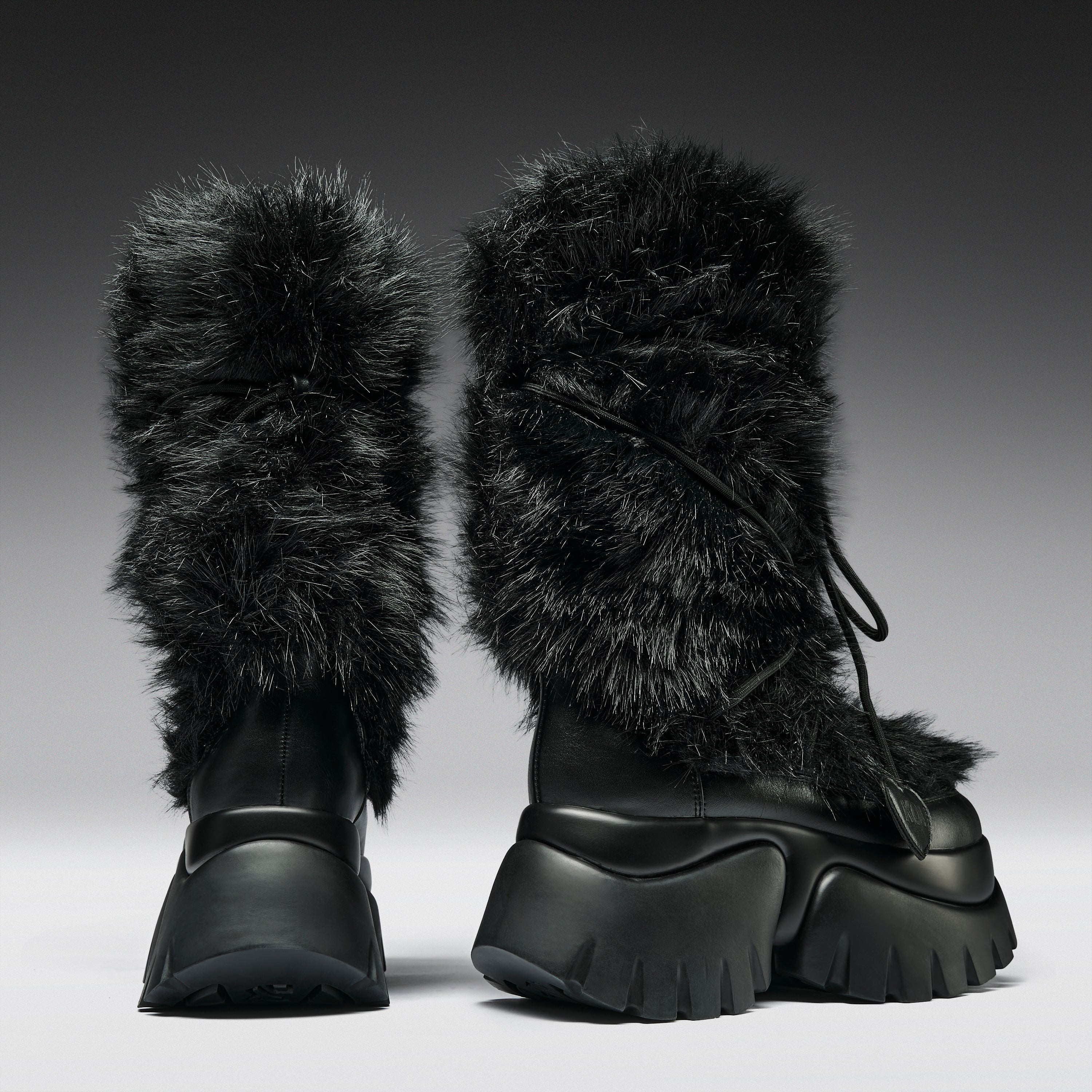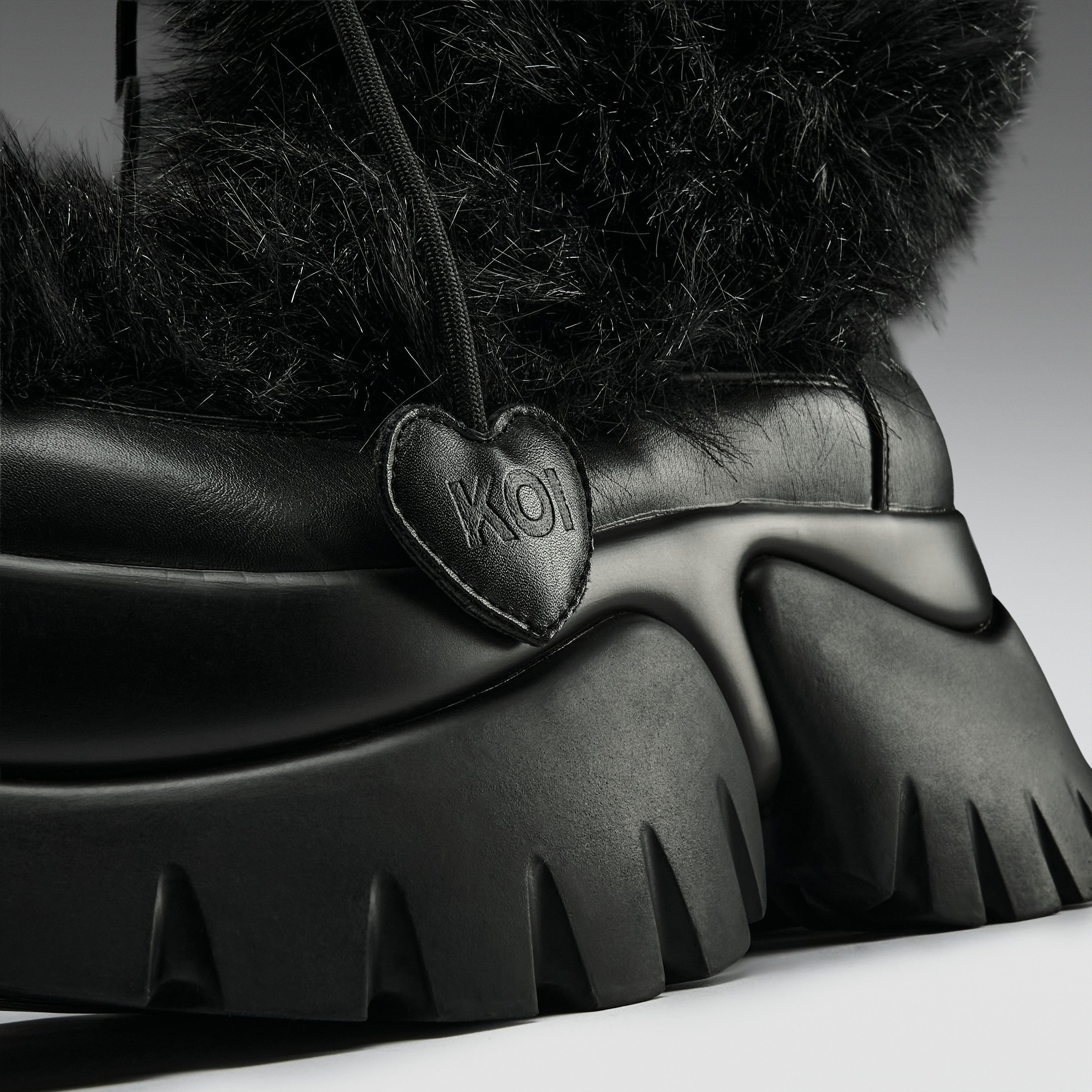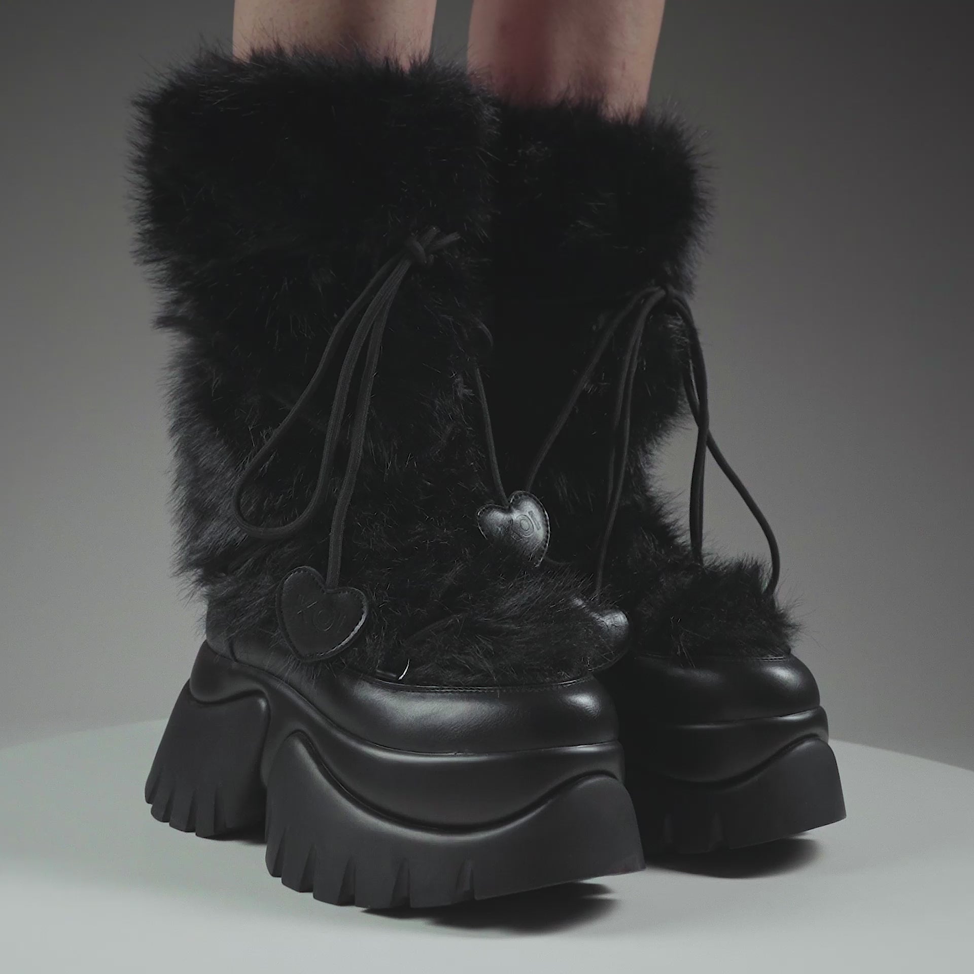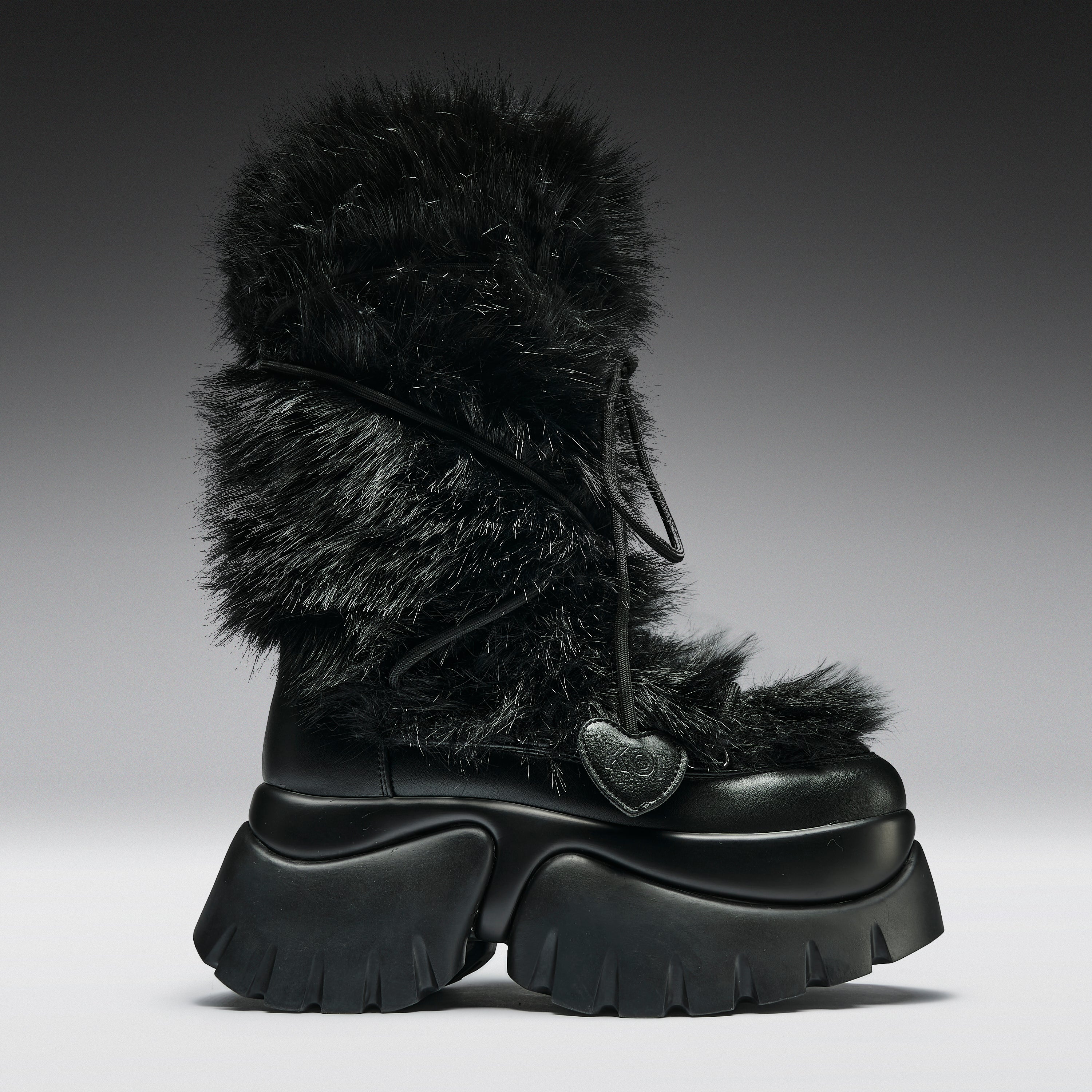 The Midnight Sasquatch Boot takes winter glam to stomping new levels—think oversized faux fur, chunky platform soles, and heart-shaped toggles that hit different. She's unapologetically extra and designed to stand out, whether you're on icy pavements or the rave floor at 3AM.