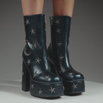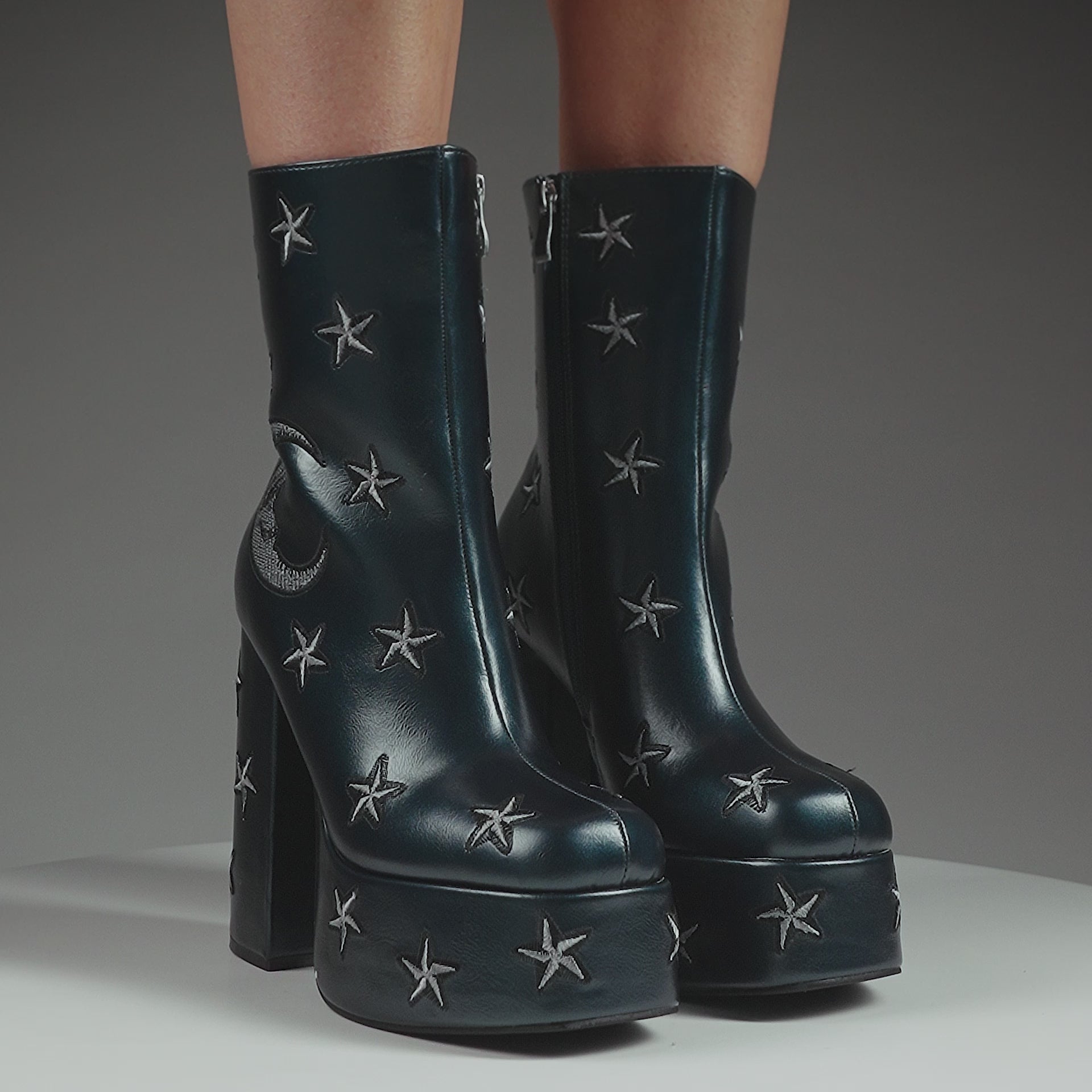 What's up witches? Feel magically creepy in the most glamorous way in these chunky ankle boots for women. With enchanting moon and stars embroidery, these celestial platform heels will have you ready to cast a spell this Halloween. Heeled boots are the perfect way to add height to your look this fall, and these come in a spooky shade of teal green.