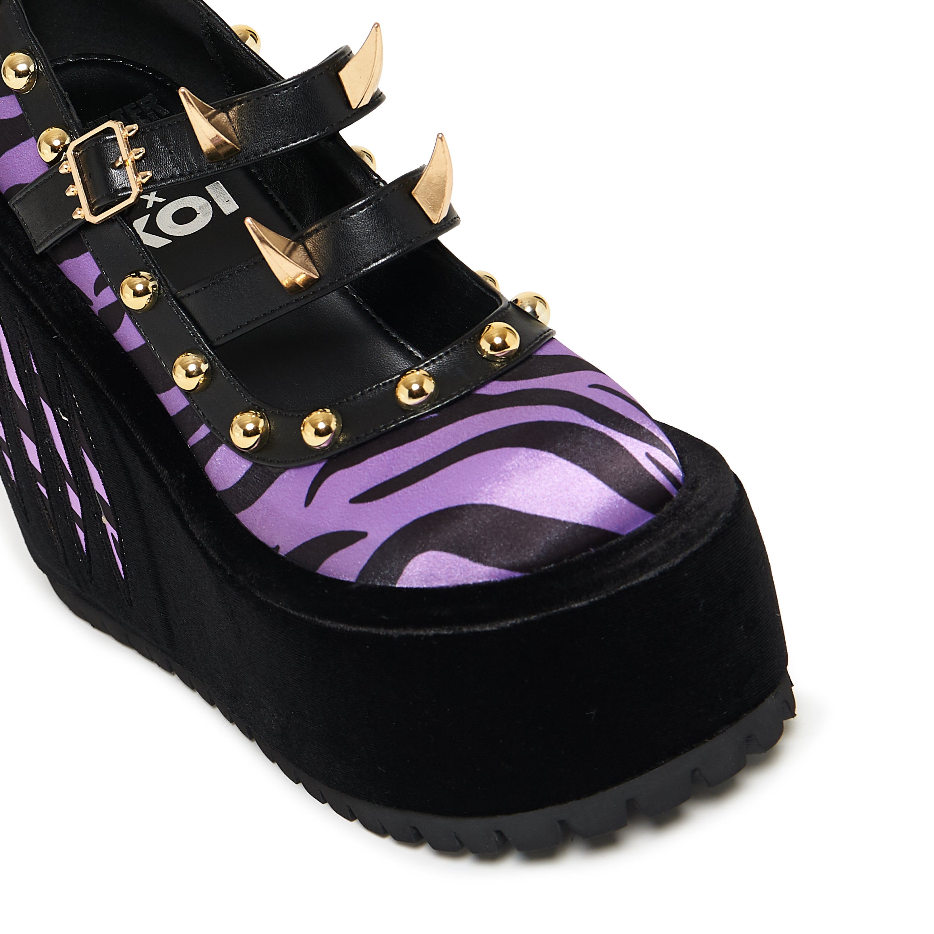 Fierce, bold and unapologetically Clawdeen. These towering wedges slash through the ordinary with claw mark cut outs and wild purple zebra stripes that celebrate her untamed werewolf side. Studded straps and gold detailing bring her passion for fashion to life, making these platforms the ultimate howl at the moon statement. Built for strutting through the Monster High corridors to meet her besties Frankie and Draculaura, they are confident, creative and full of energy, just like their muse.