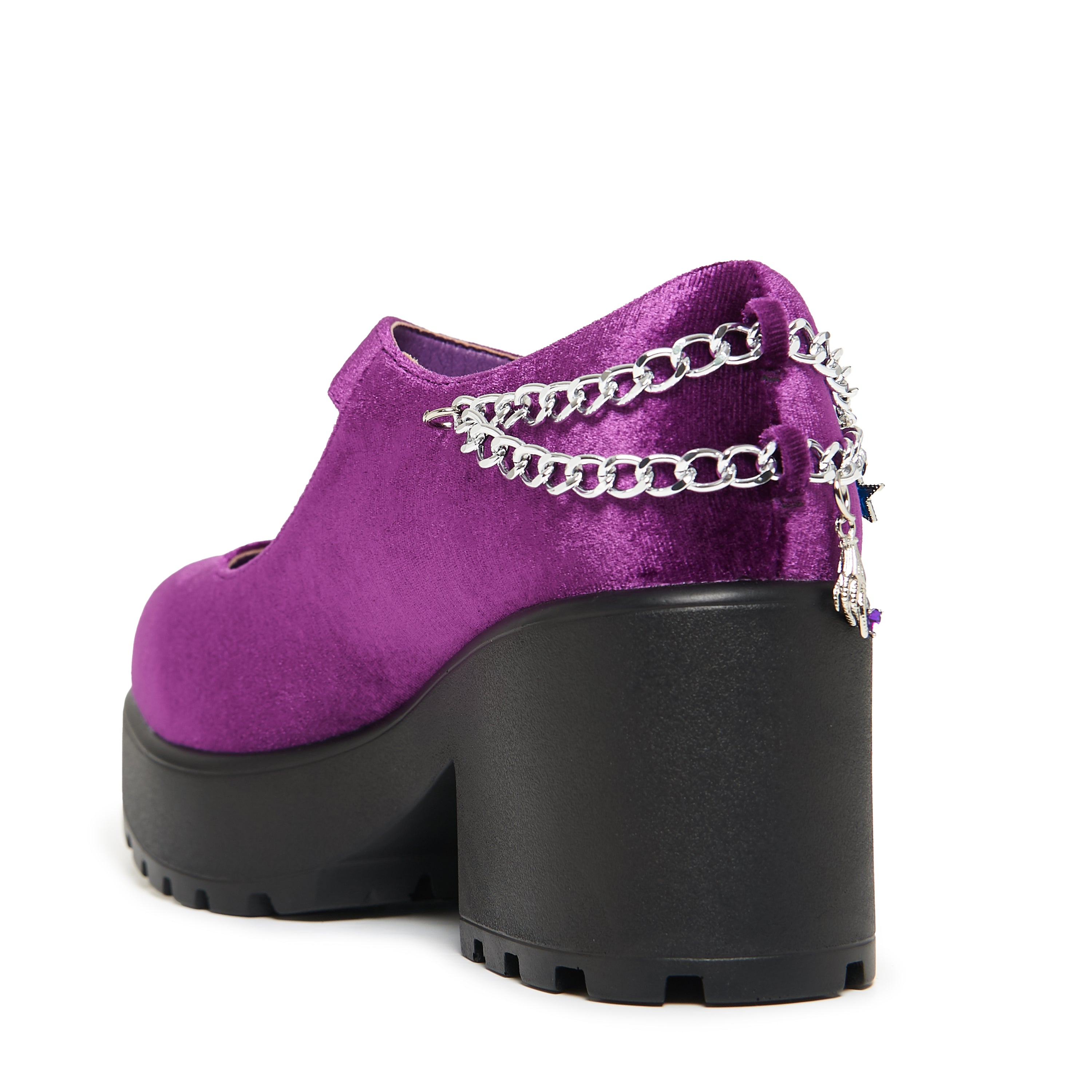 The Tira Mary Janes ‘Fatal Touch Edition’ are back in purple velvet with silver charm chains, tarot-inspired details, and a sculpted hand buckle, this time with extra bite. Built on a chunky tread sole with a mid block heel, this version brings all the comfort of the original with a moodier, spellbound energy.