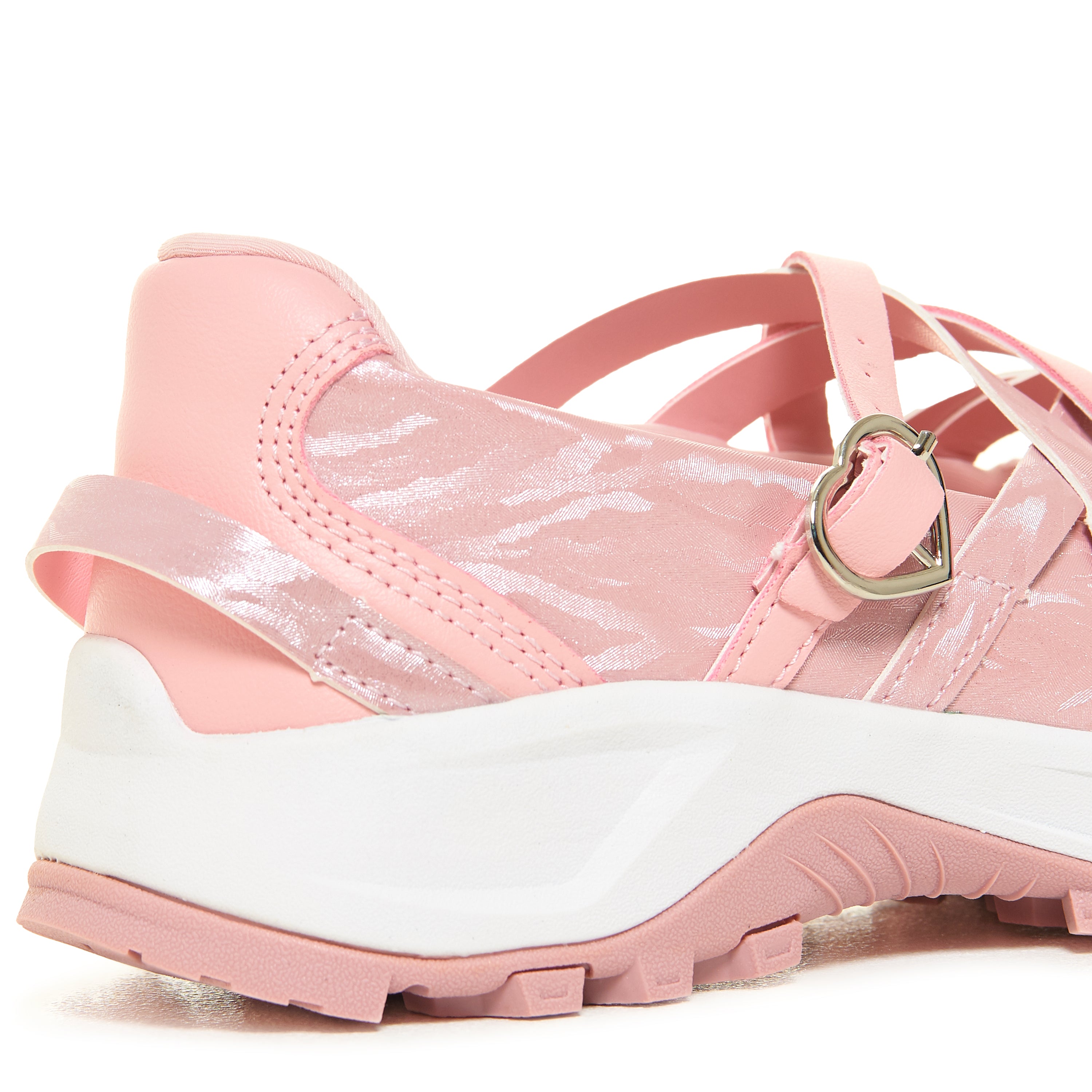 Where balletcore sweetness collides with trail-ready practicality, this hybrid Mary Jane is made to turn heads and keep up. With shimmering satin-look fabric, a criss-cross strap detail, and heart-shaped buckle for that delicate edge — all grounded on a chunky, grippy sole made for movement.
