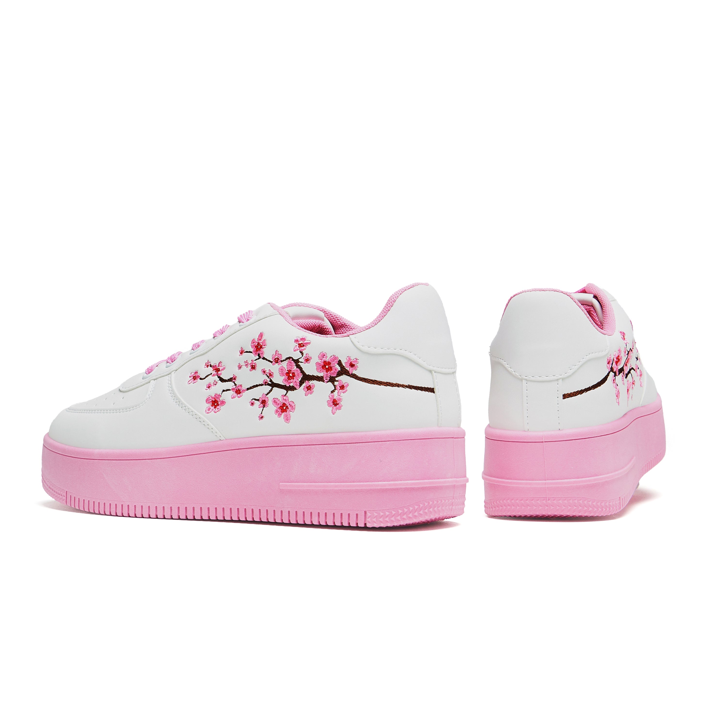 Inspired by the fleeting beauty of the cherry blossom, these trainers are comfortable and perfect for more daily wear, but with a twist for dreamers. The upper is high quality faux leather embroidered delicately with a bough of sakura. The pastel pink sole adds a touch of sweetness while providing slight height, perfect for those who love a little added lift. Matching pink laces and interior lining complete the look, bringing a harmonious balance of softness and street-style edge.