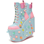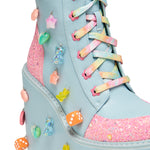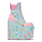 Part of our Decora drop, these tower platforms come dipped in pastel blue with glitter-pink panels, rainbow laces and a full-on scatter of charms. Think gummy bears, clouds, stars, hearts, dice and candy-sweet surprises all over — no side left unstyled.